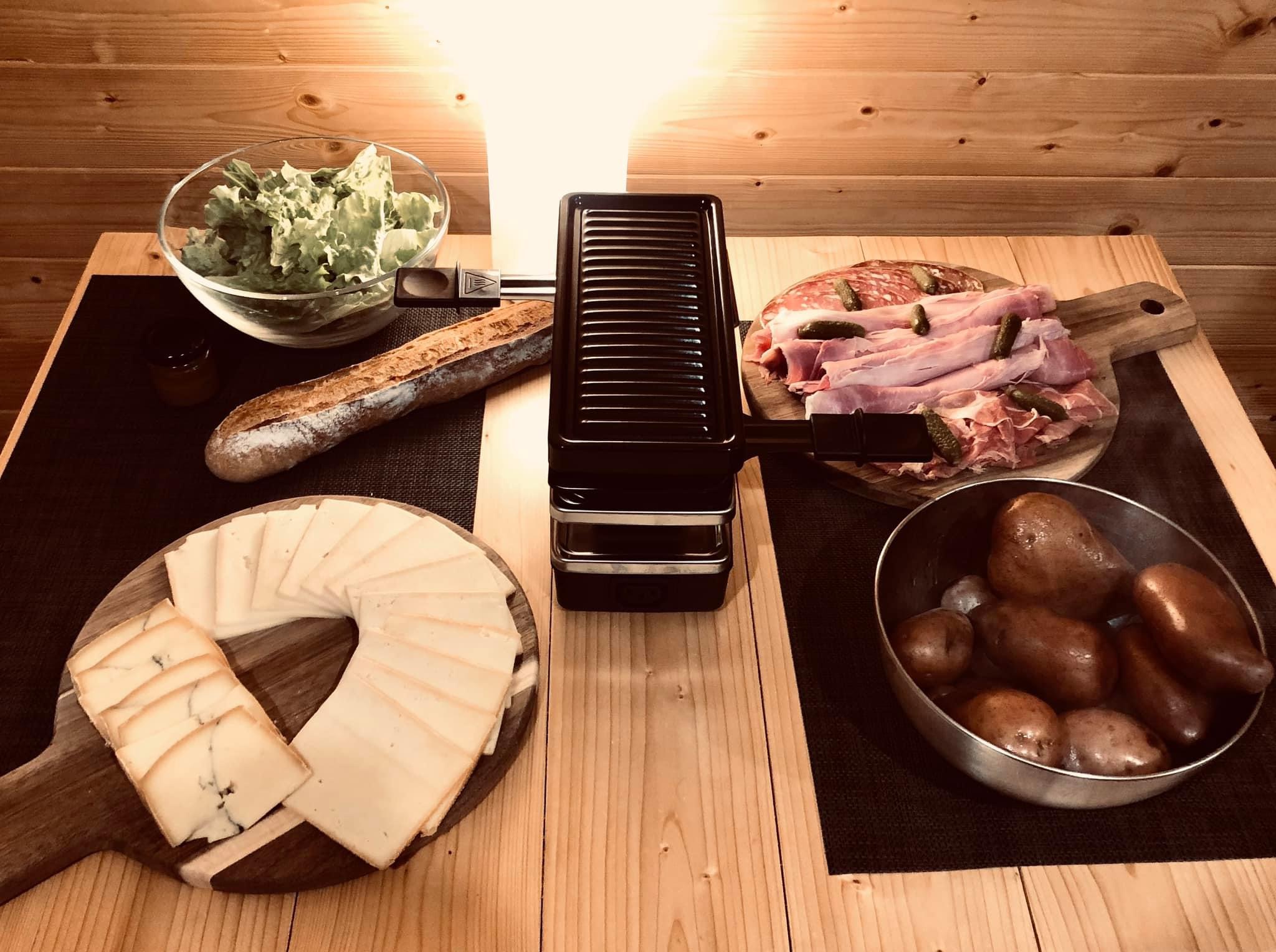 Assortiment 2 fromages, planche de charcuterie, pommes de terre, pain maison.